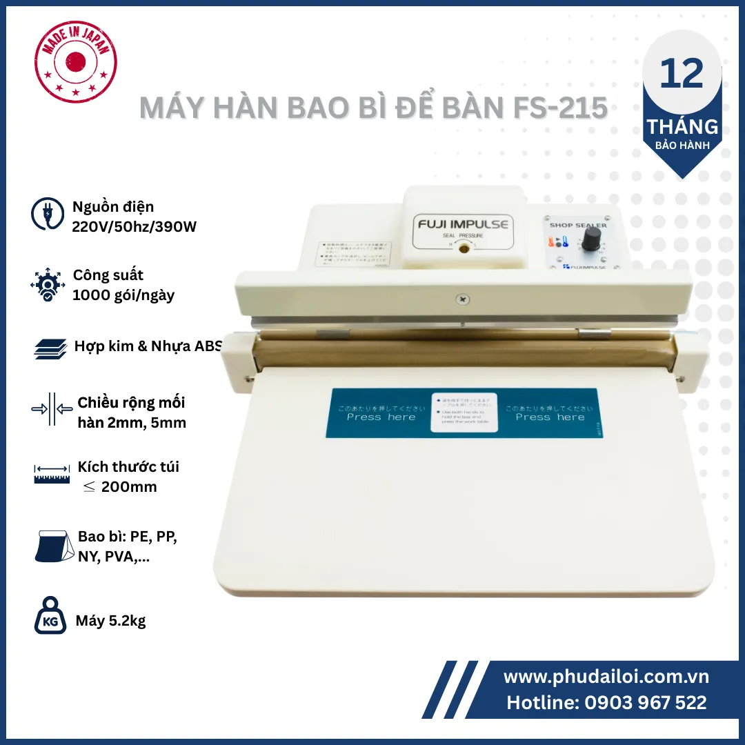 Máy hàn bao bì để bàn FS-215 là sản phẩm nhập khẩu trực tiếp từ Nhật Bản, nổi tiếng với công nghệ tiên tiến và độ bền bỉ. Chúng tôi cam kết cung cấp sản phẩm chính hãng với thời hạn bảo hành 12 tháng, mang đến sự an tâm cho khách hàng trong quá trình sử dụng.