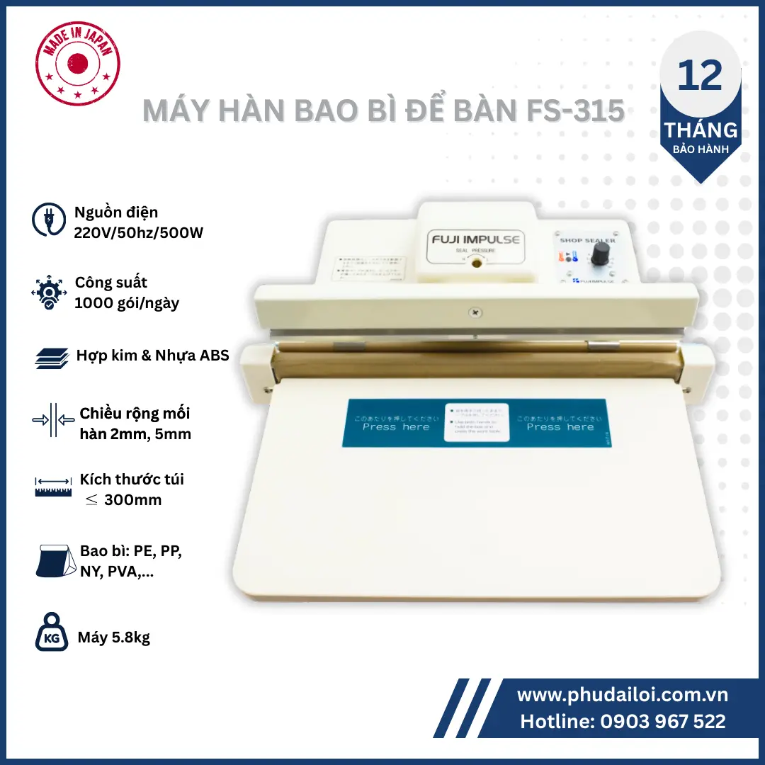 Máy hàn bao bì để bàn FS-315 là sản phẩm nhập khẩu trực tiếp từ Nhật Bản, nổi tiếng với công nghệ tiên tiến và độ bền bỉ. Chúng tôi cam kết cung cấp sản phẩm chính hãng với thời hạn bảo hành 12 tháng, mang đến sự an tâm cho khách hàng trong quá trình sử dụng.