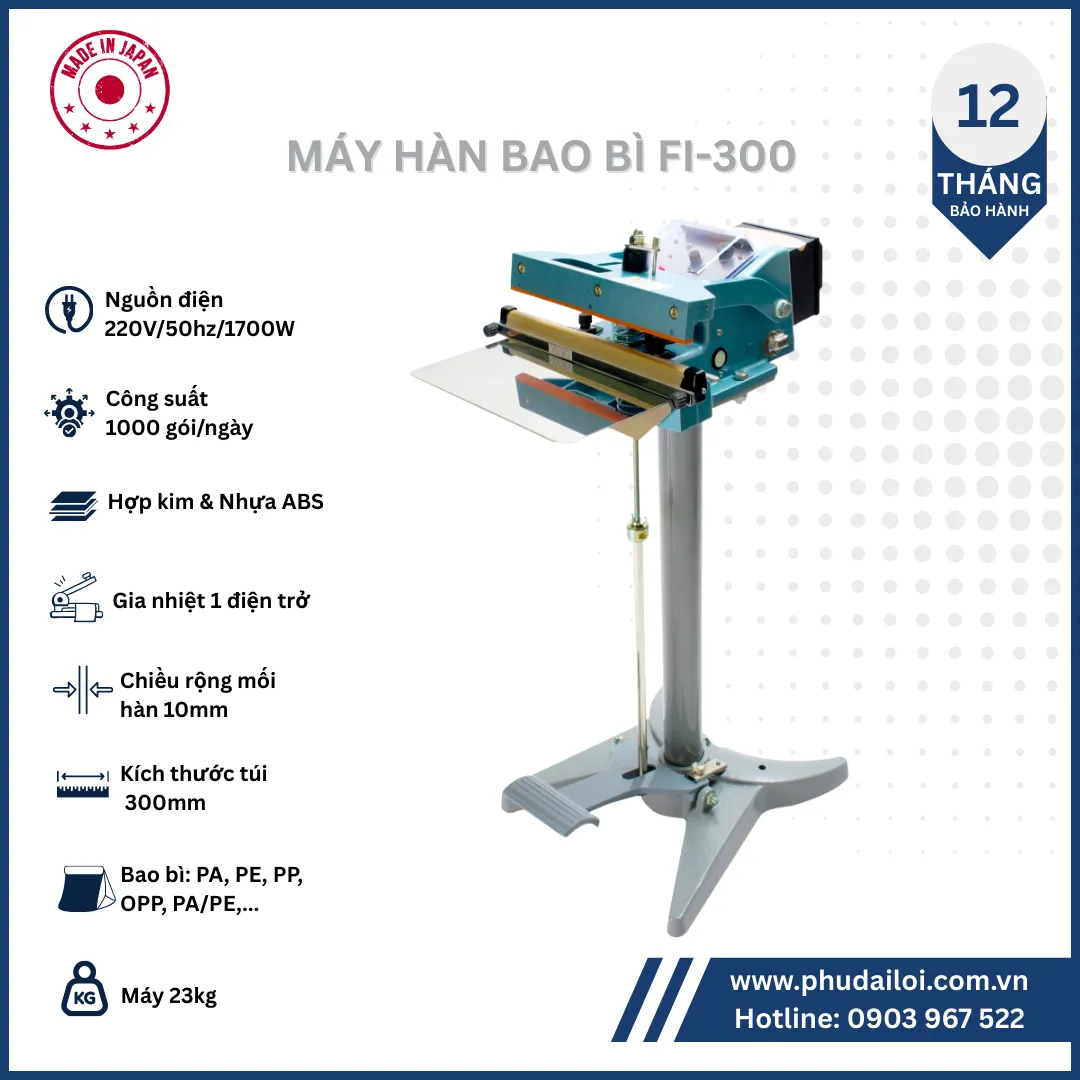 Máy hàn bao bì đạp chân Fi-300 là một giải pháp đóng gói hiệu quả và mạnh mẽ cho các sản phẩm cần đường hàn dài tối đa 300mm. Với thao tác đạp chân đơn giản, khả năng điều chỉnh nhiệt độ linh hoạt và công suất lớn, đây là một công cụ hữu ích giúp tối ưu hóa quy trình đóng gói của bạn.